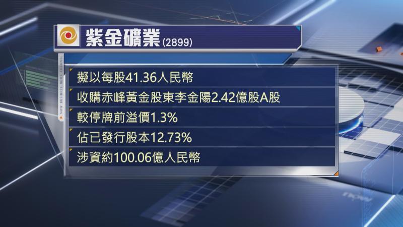紫金旗下全資子公司紫金黃金以每股41.36元人民幣,溢價1.3%,向赤峰大股東李金陽全數購入2.42億股A股,佔已發行股本12.7%,涉資約100億元人民幣。