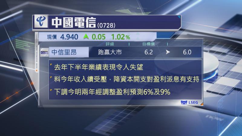 【Now財經台】中信里昂下調中國電信(00728)目標價3%,由6.2元降至6元,維持「跑贏大市」評級。