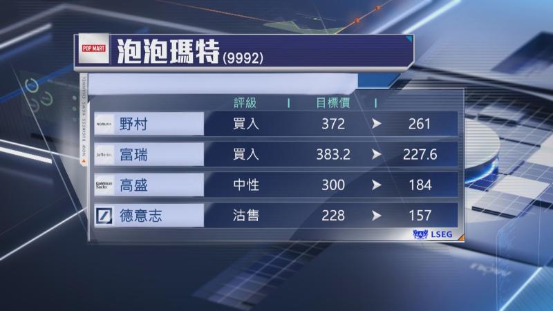 美銀證券則將評級降至「中性」,及將目標價大幅下調43%至170元。美銀指出公司今年收入增長指引低於市場預期的30%,LABUBU在歐美熱潮降溫,加上利潤率壓力增加,對今明兩年經調整每股盈利預測,分別下調19%及26%。