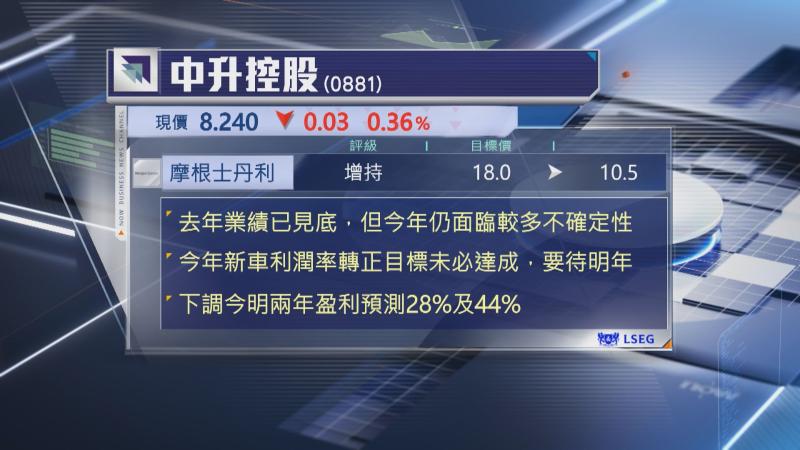 【Now財經台】摩根士丹利大削中升控股(00881)目標價逾40%,由18元降至10.5元,維持「增持」評級。