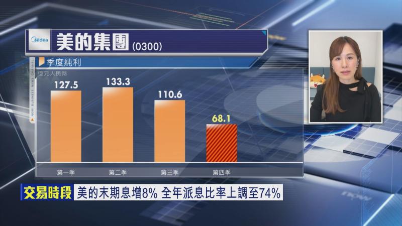 富途證券高級分析師馮文慧表示,美的去年第4季盈利放緩,主要受「以舊換新」政策影響,但喺內房持續疲弱下,美的業績已經算唔錯,派息亦相對吸引,含金量高,喺波動市況下,高息股喺長期資金停泊嘅理想選擇。