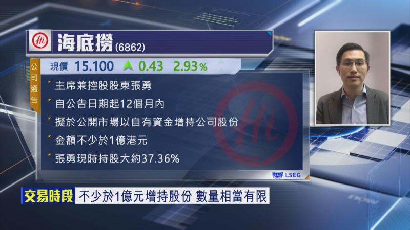 【Now財經台】海底撈(06862)中午公布主席兼大股東張勇計劃喺未來12個月,掟唔少於1億元增持公司股份,消息一出,股價午後即拗腰抽高,一度高見15.25元,升近4%,可唔可以跟搭一轉順車?