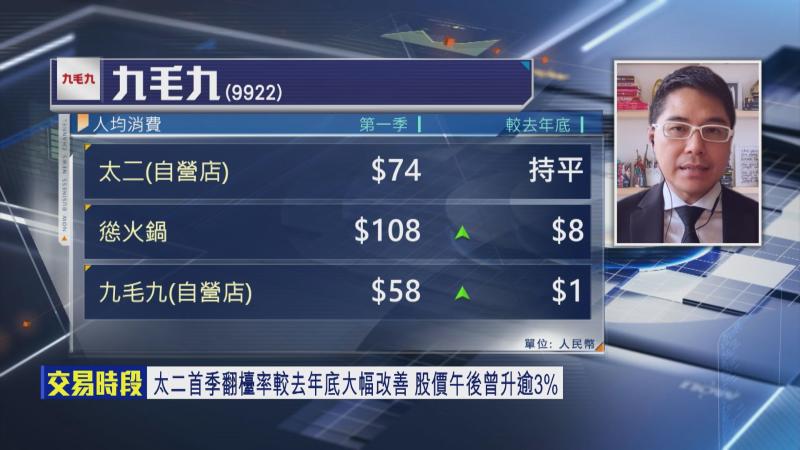 【Now財經台】九毛九(09922)上周五(10日)出咗季度數據,其中,旗下自營店太二翻枱率每日3.5次,人均消費保持74元人仔,表現較慫火鍋及九毛九西北菜有改善。九毛九股價今日(13日)下晝逆市彈高,一度升3.7%,高見1.94元,九毛九上季嘅好表現,可唔可以延續落去?