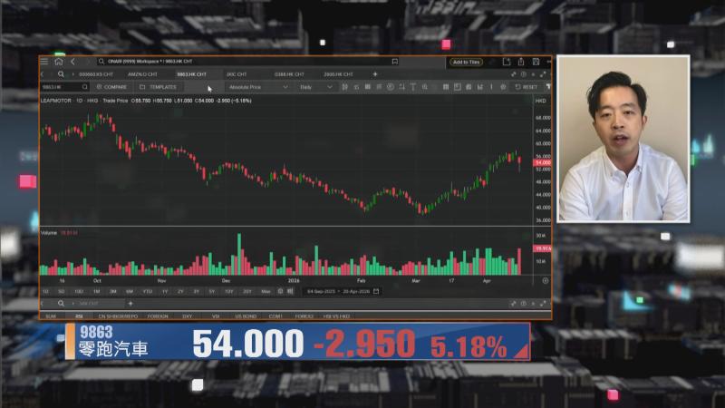 佢又話,汽股嚟講,吉利汽車(00175)及比亞迪股份(01211)係少數轉強嘅股份,至於零跑只要繼續企穩喺52元樓上,可以繼續睇好,有貨可以繼續持有,冇貨就等股價落返52元水平再做部署。