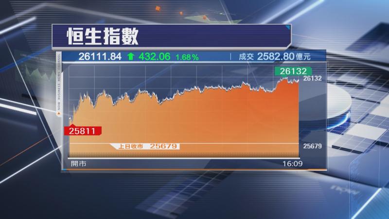 【Now財經台】本港股市於期指結算日顯著反彈,恒生指數大升逾400點,重上26000點水平,終止兩連跌。