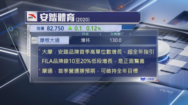 【Now財經台】摩根士丹利及摩根大通均表示,安踏體育(02020)首季營運數據勝預期。(02020) 【分析】 2026/04/14 12:58